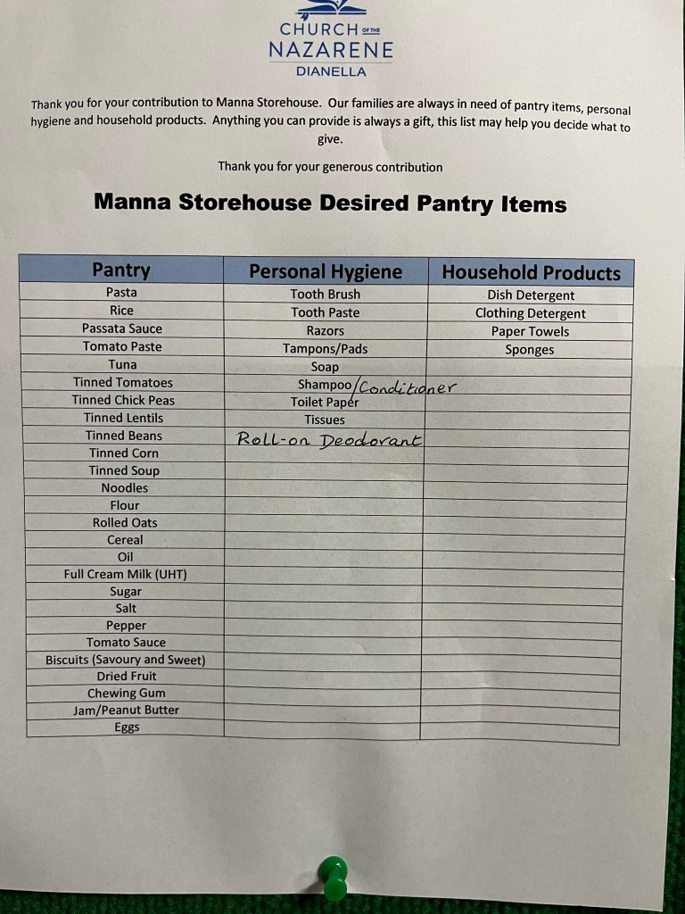 Manna Storehouse is run by volunteers who love helping people. We all have been helped by others at times in life. We are open on Mondays between 3-4 pm. Please send us an email at office@dianellanazarene.org to register and let us know you are coming. 🙂